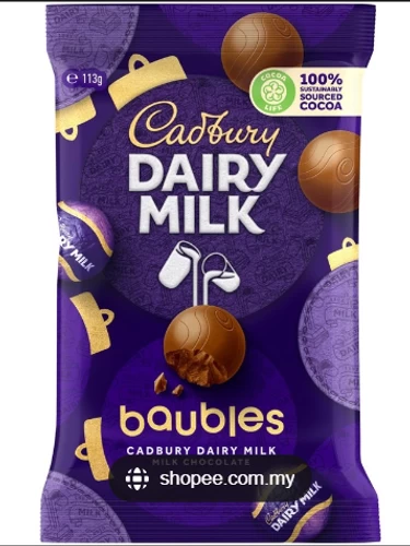 Crafted with 100% sustainably sourced cocoa, Cadbury Dairy Milk Baubles are not only a delicious treat, but theyre also doing good for the planet. Cadbury believes that by sourcing their cocoa sustainably, theyre making a positive impact on farmers and their communities.