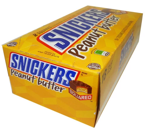 Mars Snickers peanut butter (18 x 50.5g bars) – 2 scrumptious squares filled with peanut butter, peanuts, caramel & nougat and covered in milk chocolate.